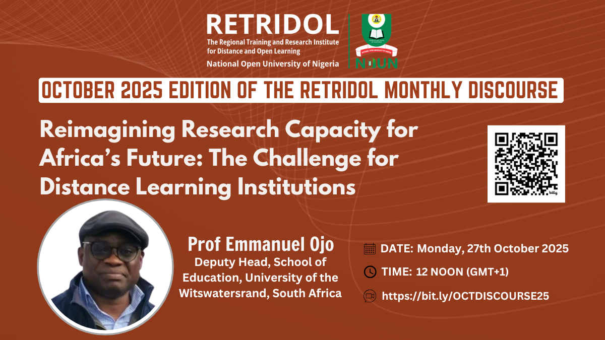 The Regional Training and Research Institute for Distance and Open Learning (RETRIDOL) at the National Open University of Nigeria (NOUN) cordially invites you to the October 2025 RETRIDOL Monthly ODL Discourse: